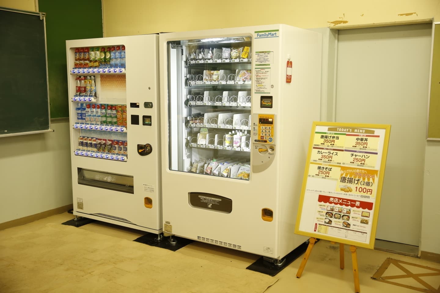 ファミリーマートの自動販売機や昼食時に弁当販売があります。